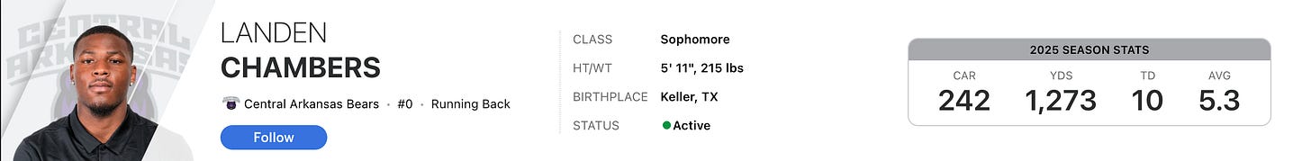 Landen Chambers checks a box I care about immediately: he produced like a true focal point of an offense. At Central Arkansas, he was a workhorse RB that ran for 100+ in 8 straight games. Now he’s at UCF, where he joins another transfer, Duke Watson. I consider Chambers a better RB in terms of true workload potential. Watson, I see more as a speedy back to change the tempo. I honestly think in terms of who starts, it’s probably interchangeable, but Chambers will get opportunities.
