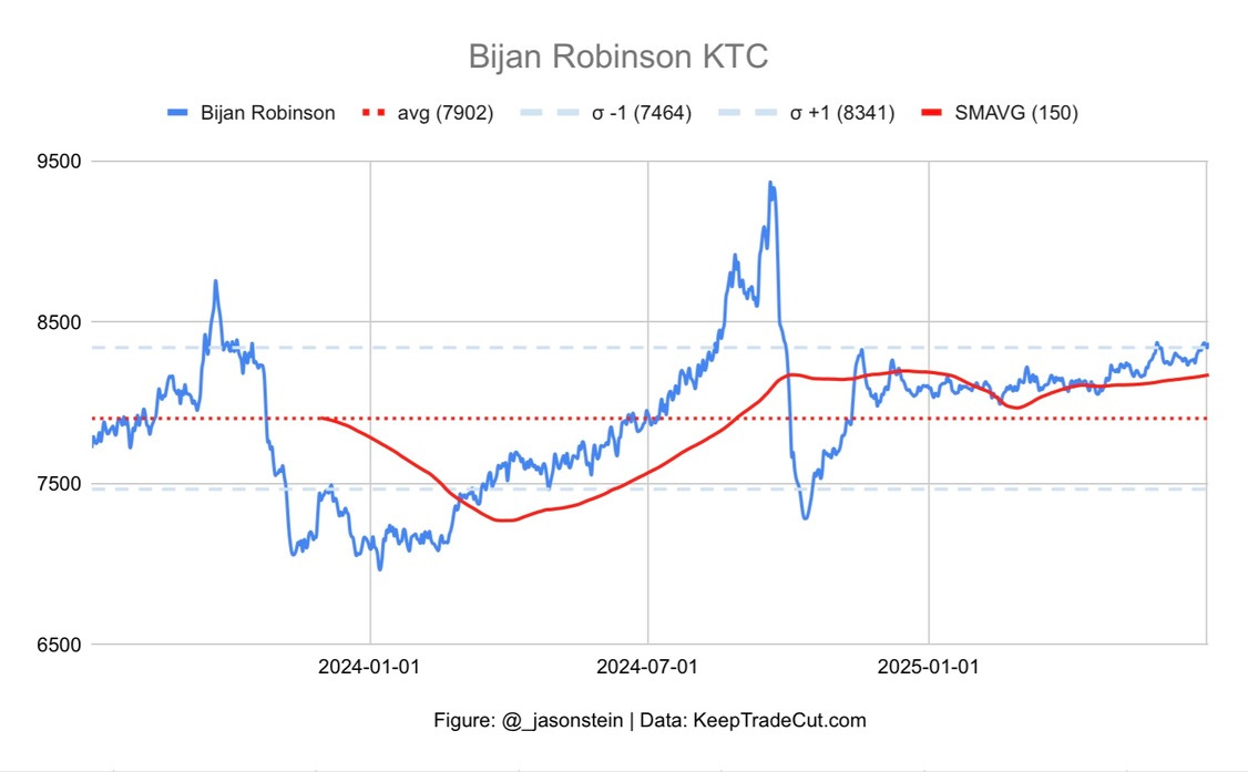 Chart Analysis: Bijan Robinson's chart displays a bullish setup, supported by strong technical indicators. His KTC price recently crossed above the 150-day moving average, a classic signal of a potential trend reversal, and it's now pushing toward the +1σ line (~8341), where previous rallies have faced resistance. After two sharp corrections in late 2023 and mid 2024, Bijan's price stabilized near the long-term average (~7900), forming a solid base. With the moving average now sloping upward and price holding above both the mean and prior support, momentum is clearly on his side. The current chart suggests Bijan is in the early stages of another upward run, keep an eye on how he handles resistance at the upper bound.