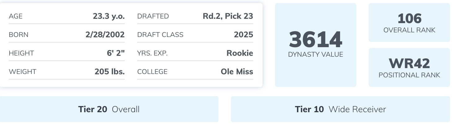 McConkey remains a strong WR2 with weekly upside, especially in full PPR formats, and the movement-based role only helps. Tre Harris, though, is the sneaky dynasty play here. His value is still palatable, but the buzz is building. Get in now before training camp clips and preseason hype hit the timeline. He could be a top-3 riser among rookie wideouts by mid-August.