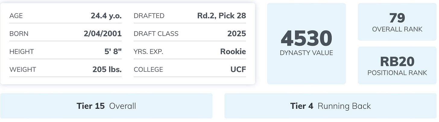 Here’s the thing, though, this is exactly why I was worried about Harvey’s rookie draft price post-NFL Draft. He was consistently going in the mid-to-late first round of rookie drafts, and it felt a little rich for a guy without guaranteed volume in year one. Dobbins signing in Denver doesn’t tank Harvey’s long-term outlook, but it does cloud that short-term workload projection that was inflating his value.