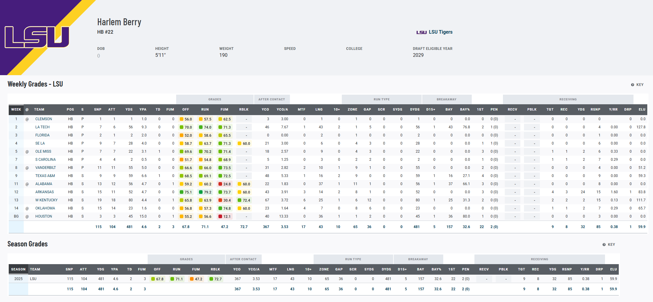 Berry quietly put together a strong freshman campaign, accounting for over 500 yards and emerging as LSU’s most productive runner down the stretch. That matters. Not just the production, but when it came. As the season went on, Berry got more comfortable, earned more trust, and eventually took over a larger role in the offense.
